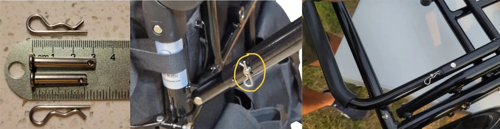 Pins 1.25" (3 cm) are for locking the shocks. 1" pins (2.5 cm) are for securing the lower part of the kickstand.