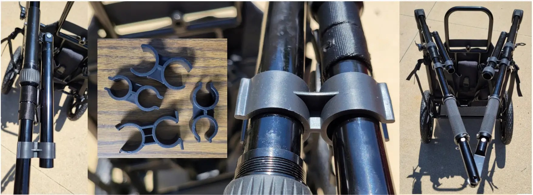 Double-port plastic clamps can be used to hold the crossbar tubes while disconnected, for instance, in BIKE MODE, or to hold the handlebars with the frame or kickstand while the cart is collapsed.